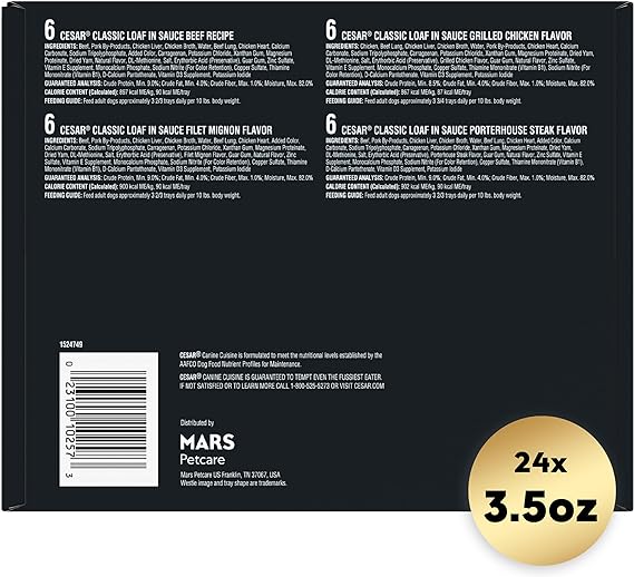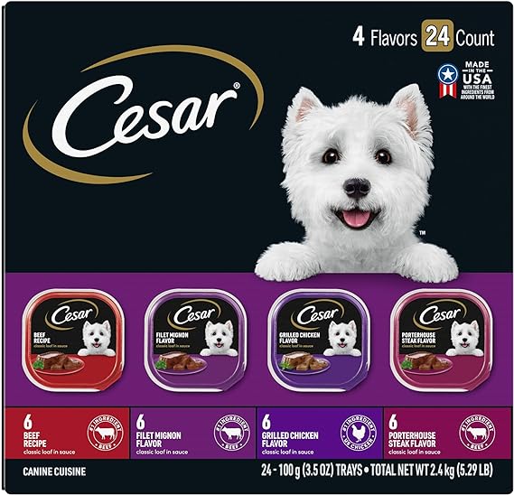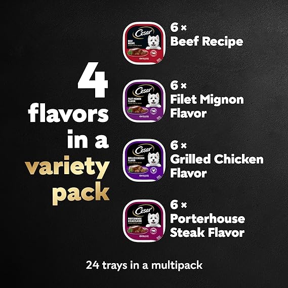 Brand Cesar Flavor Beef, Filet Mignon, Chicken, Steak Age Range (Description) Adult Item Form Pate Specific Uses For Product Digestive Health Real Meat is the #1 Ingredient: With real meat as the #1 ingredient, Classic Loaf in Sauce complements any dry food or stands alone as a tasty meal Made in the USA with the finest ingredients from around the world Quality Recipe: Contains no fillers, no artificial flavors, and is formulated without grains* (Trace amounts may be present due to cross-contact during manufacturing) Peel Away Seals: CESAR Classic Loafs gourmet soft dog food is served in convenient trays with easy, peel away seals. Deliciously Complete Meal: This single serve, complete and balanced meal for adult dogs makes every mealtime delicious Contains twenty-four (24) 3.5 oz. easy peel trays of CESAR Wet Dog Food Classic Loaf in Sauce Beef Recipe, Filet Mignon, Grilled Chicken and Porterhouse Steak Variety Pack