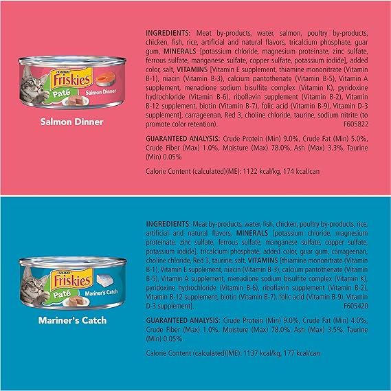 Made with seafood and chicken with a smooth, pate cat food texture to tempt her to her dish Multi-can with seafood or chicken pate cat food variety pack makes it easy to stock your pantry with an array of delicious tastes she can't resist Provides 100 percent complete and balanced adult cat food nutrition, including essential vitamins and minerals in every serving Friskies canned cat food pate variety pack checked for quality and safety to provide added peace of mind and formulated to meet or exceed industry standards for cat food Packaged in recyclable pull-tab cat food cans and proudly manufactured in our Purina-owned U.S. facilities