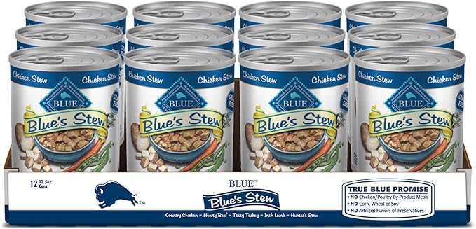 REAL CHICKEN FIRST: This grain free wet dog food features high-quality protein from real chicken to support healthy muscle maintenance FEED THREE WAYS: Blue’s Stew adult dog food makes a delicious treat, adds interest mixed into their favorite dry foods or can be fed as a meal on its own NATURAL DOG FOOD: All BLUE canned dog foods are made with the finest natural ingredients and enhanced with vitamins and minerals WHOLESOME INGREDIENTS: BLUE wet dog food contains NO chicken (or poultry) by-product meals, NO corn, wheat (a common thickening agent used by other brands) or soy, and NO artificial flavors or preservatives Contains twelve (12) 12.5-oz cans of Blue Buffalo Blue's Stew Natural Adult Wet Dog Food, Chicken Stew