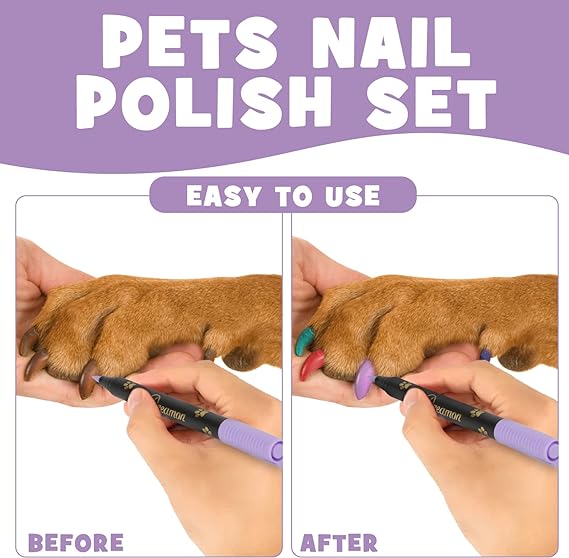 [Dog Nail Polish Pens] 14 colors pet nail polish set to meet a variety of design ideas and create unique pet nails, much fun for you and your pets. [Dog Safe Nail Polish] Nail Polish Pens Quick Dry is made of water-based and non-toxic material and is friendly for Pets. Smooth Nip Brush Pen, no need to pump. Pen Brush Nip is suitable for covering small and delicate areas. [Easy to Use] Use the nail polish for the dog to start coloring from the root of the nail, Quick-dry and waterproof in 30 seconds. And remember to close the back cover tightly after use. And can be used as a pen to record and describe in daily life. [Creative Gift] Creative Dog Accessories Nail Polish Pens can be given to your pet or pet owner's friends on holidays or parties, like Christmas, birthday parties, and Halloween. The pet nail polish pen is suitable for large dogs, small dogs, horses, rabbits, and cats. [Tips] Keep the nail surface clean and free of water before coloring. For darker nails, it is recommended to use a white base to enhance color. Avoid rubbing the nails after coloring. Use a pet nail polish brush to touch up the paint if there is partial wear.