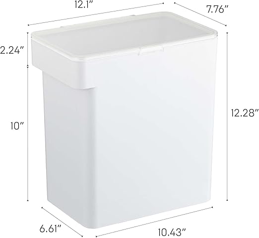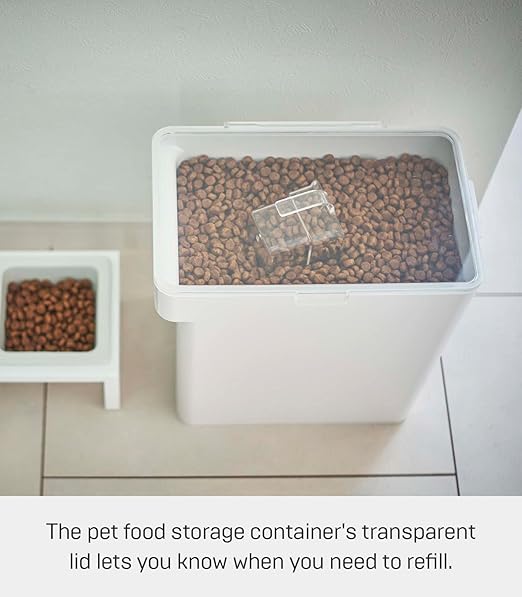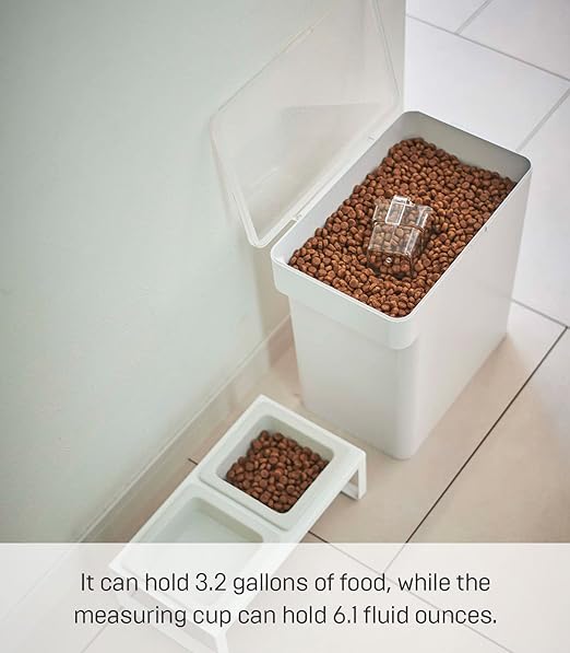 DIMENSIONS AND WEIGHT: This product is 7.76 x 12.09 x 12.28 inches (L x W x H) and weighs 2.65 pounds. AIRTIGHT PET FOOD STORAGE: This airtight pet food storage container keeps both you and your dog or cat happy with fresh food in an attractively designed holder. THOUGHTFUL DESIGN: The pet food storage container's transparent lid lets you know when you need to refill, and the container's bottom is specifically designed to make scooping the last piece of food out easy with the included measuring cup. CAPACITY: The container can hold 3.2 gallons (12 quarts) of food, while the measuring cup can hold 6.1 fl oz. CLEANING INSTRUCTIONS: All parts of the container can easily be broken down for thorough hand cleaning. COLLECTION: Our Tower collection features clean lines and modern designs available in black and white, enabling the line to fit seamlessly into any modern home. Most of our Tower line is made from steel and has a matte or textured finish. BRAND: Inspired by “small-space living” in Japan, Yamazaki creates truly unique, ultramodern products that are mindfully designed to make incremental improvements throughout the home and elevate quality of life. Yamazaki. Home, simplified.