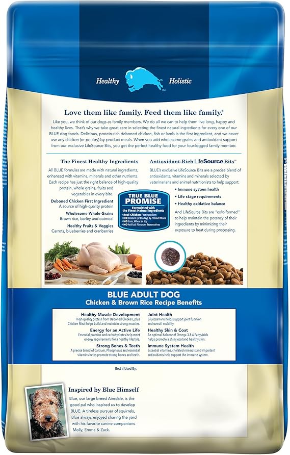 REAL CHICKEN FIRST: This Blue Buffalo dog food is made with real, high-quality chicken as the first ingredient NUTRITION FOR ADULT DOGS: BLUE Life Protection Formula adult dry dog food helps build and maintain strong muscles with high-quality protein IMMUNE SYSTEM SUPPORT: This natural dog food features exclusive antioxidant-rich LifeSource Bits HEALTHY, WHOLESOME INGREDIENTS: Blue Buffalo dry dog food is made with no chicken (or poultry) by-product meals and no corn, wheat, or soy Contains: One (1) 34-lb. bag of BLUE Life Protection Formula Natural Adult Dry Dog Food, Chicken & Brown Rice Recipe ENHANCED IMAGERY: We have enhanced our digital product packaging to highlight our products’ ingredients and essential benefits. While the physical packaging will differ slightly, all information is accurate