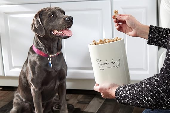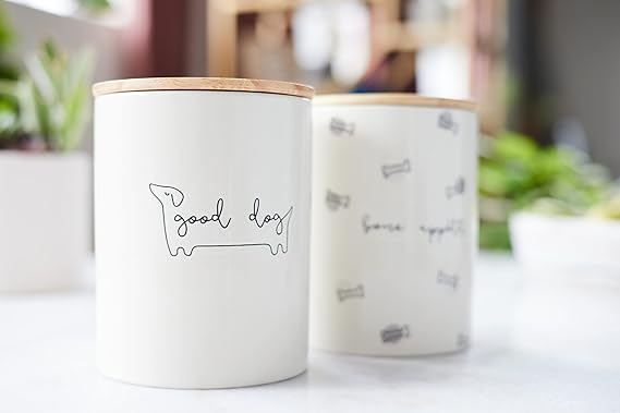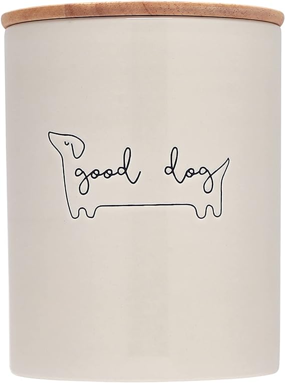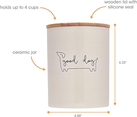 Ceramic Dog Treat Jar: Store your furry friends favorite treats in style with this adorable, good dog treat jar by Pearhead. Big and tall enough for small dog treats or large dog treats, this dog treat container is the perfect choice for dogs of all sizes Dishwasher Safe: This beige ceramic treat canister with a neutral wooden lid features a silicone seal to keep your dog food fresh. This treat jar is microwave safe and dishwasher safe making it easy to clean Modern Dog Treat Canister: This modern and trendy pet biscuit jar will look great with any home décor or kitchen décor style, making it the perfect home accessory for any dog owners or cat owners with pets of any age, size or breed! Pet Owner Gifts: This treat storage container is the perfect pet gift, dog gift, cat gift, adoption gift, new puppy gift, new kitten gift or gift for any occasion for pet owners and their four-legged friends Dimensions: 4.875” W x 6.25”H Holds: 4 cups / 32 oz