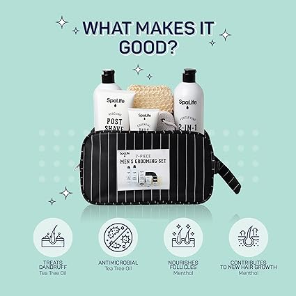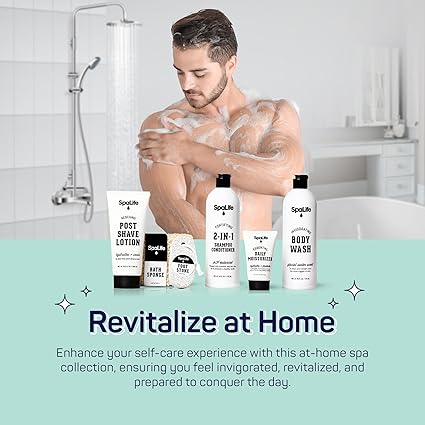 MEN GROOMING UPGRADE: Indulge in the gentlemanly luxury of our SpaLife Bath and Body Men Grooming Gift Set. Enriched with potent skin-cleansing agents and nourishing moisturizers to deliver lasting moisture, all featuring an invigorating Glacial Water scent. INVIGORATE AND HYDRATE: Our pH-balanced Invigorating 2-in-1 Shampoo and Conditioner, infused with menthol and tea tree oil for cleansing, fortifying, and promoting scalp health, banishes dryness and dandruff. Complement this with our Soothing Post-Shave Lotion, your rescue from post-shave discomfort, for deep hydration, a soothing sensation. REFRESH AND MOISTURIZE: Start your day with a refreshing jolt as our invigorating Glacial Water Scented Body Wash awakens your senses, while our lightweight Daily Moisturizer provides all-day hydration and protection, ensuring your skin looks its absolute best, regardless of what the day brings. LUXURY SPA AT HOME: Our 7-Piece Bath and Body Men Grooming Gift Set includes 2-in-1 Shampoo & Conditioner, Body Wash, Daily Moisturizer, Post-Shave Lotion, Bath Sponge, and Foot Stone, organized in a reusable toiletry bag, ensuring you have everything you need for a luxurious home spa experience. YEAR-ROUND MEN'S GIFT: Impress your special man with Our SpaLife Men Grooming Gift Kit for deluxe relaxation, perfect for holidays, Christmas, anniversaries, weddings, Father's Day, Valentine's Day, milestone birthdays, or simply as a thank-you gift as a thoughtful gesture to show your appreciation. Includes a sleek reusable toiletry bag, making it easy to take your spa experience on the go.