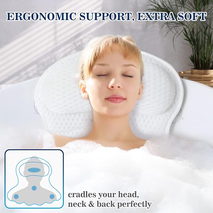 Polyester Fibre Maximum Support & Nice Padding - The ergonomic design of this bath pillow makes it have a super comfortable support for your tired head, neck and back. Its head rest part has extra thick padding that cradles the noggin ever so nicely. The soft padding on its side and lower part is wide and long enough that it covers the lower back area, up to the neck. (Note: This is solely designed by us. We have got the design patent in US and all rights reserved.) Extra Soft & Fast Drying Fabric - Our bathtub pillow uses upgraded breathable 4D air-mesh material, which allows constant airflow to make this bath pillow dry very fast. It is super soft and skin friendly. The water will not sip up to the headrest while bathing, your hair will be perfectly dry after a long bath. Non-slip Suction Cups - 6 extra-large vacuum suction cups provide great stability for the bath pillow. No slip and slide. Also remove with ease by lifting a tab that's attached to each suction cup. These power suction cups don’t rip off. Easy to Clean - Machine washable. Comes with a mesh bag to wash it in the washing machine, so the suction cups of our bath pillows for tub won’t adhere to the machine. Also has an attached hook to hang dry after use. Fits Any Tub - Our bath pillows for tub work with most attached and free standing tubs, spas and hot tubs. Nice packaging. It’s a perfect gift for the bath lover in your life. Pillow overall size(L*W*H) is 17*17*3IN. Head part size 7*14.4* 3IN. Back part size 10*18.5*1IN.