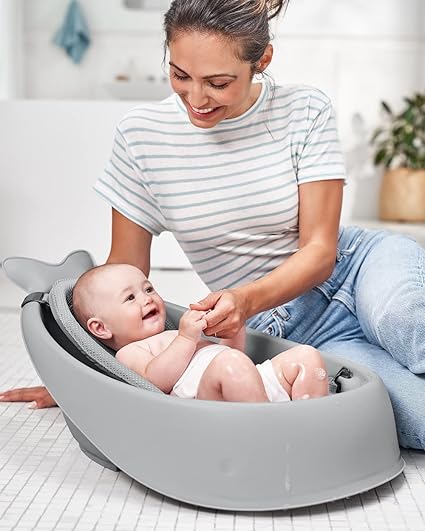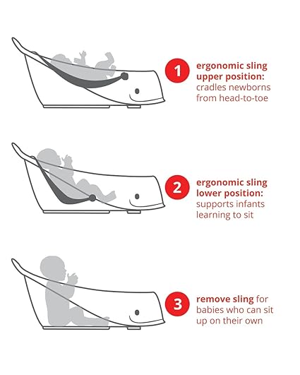 Our cheerful whale shaped Moby tub grows with baby through three stages and offers Smart Sling support The sling locks into two ergonomic positions: higher for full body support and lower for seated support Dual layered mesh and comfort edge construction securely cradles baby from head to toe He slings adjusts to a cushioned seat that comfortably supports babies learning to sit Remove the sling when baby has mastered sitting and easily bathe baby in the spacious tub no uncomfortable plastic bumps Tub grows with baby through three stages: Stage 1: Newborn (0 3 months; up to 15 lbs); Stage 2: Infant (3 6 months; up to 20 lbs); Stage 3: Sitters (6 plus months; up to 25 lbs) Featuring: Drain plug; Swivel hook for hanging on showerhead, shower bar or towel bar; Non slip interior texture