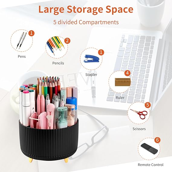 [360-degree Revolving Design]: This rotating pencil holder can be turned up to 360-degree rotation to the left and right, it spins smoothly all around without getting stuck. Easy to access, easy to get from any angle, allows you to keep all of your things within reach, keeps your stationery supplies organized and easy to find, and enables you to improve your working efficiency. [5 Independent Compartments Design]: This desktop pencil organizer is divided into 5 compartments to meet your various needs, this pencil holder is not only a stationary for organizing your office accessories, such as pen, pencil, marker, highlighters, rulers, scissors, letter openers, and many other desk widgets but also can be a makeup brush holder cup to store the makeup brushes, lip/eye liners, glosses, blushes, hair accessories, nail polish, jewelry, and more. Give you an uncluttered space. [Multipurpose Desk Organizer]: This desktop organizer is great for any space, such as an office, home, bathroom, living room, bedroom, vanity, dresser, worktop, and countertop used to store office, stationery, makeup, bathroom accessories, and worktop tools. [Modern Aesthetic Design]: A classic style gives this spinning organizer a versatile look, and striped has a sleek sophisticated design that will give your office or home décor such a classy touch. High-quality ABS makes it reliable and long-lasting, while a warm cute color adds a touch of charm. [Safe Shopping]: This desk pencil holder is the perfect gift for yourself, a friend, a college student, someone at the office, or that special person in your life. Hope you have a good shopping. If there is any problem with the product, please contact us by email immediately, and we will solve the problem as soon as possible.