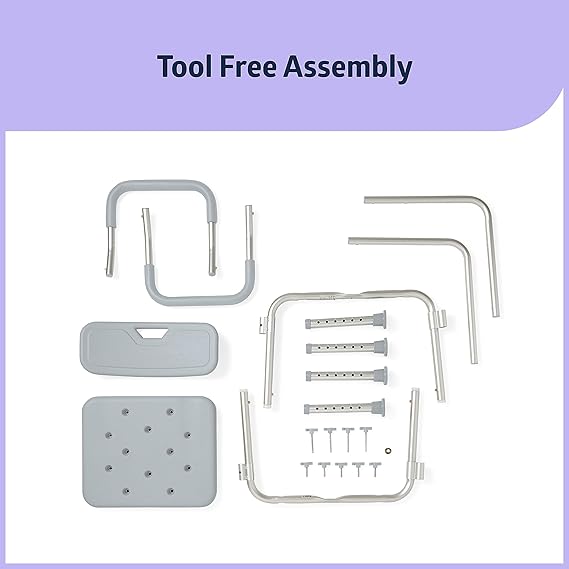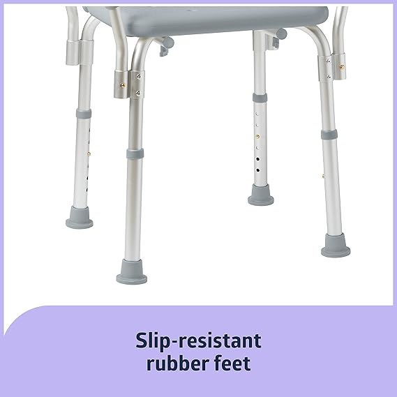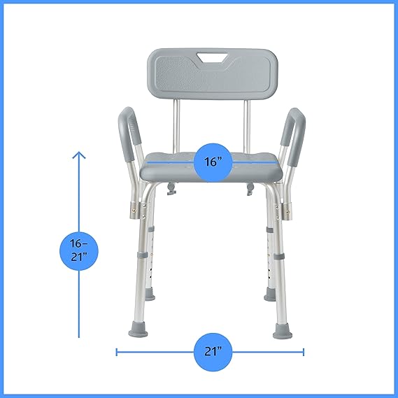 Nullify Sturdy, durable aluminum frame with textured polyethylene seat, armrests and backrest for comfortable bathing and reduced risk of falls Bath chair features easy custom height adjustability | Adjusts in 1" increments from 16" – 21" | Seat dimensions: 13.5" x 16" Wide, skid-resistant feet hold chair securely to the tub or shower floor Lightweight, rust-resistant tubing and easy-to-clean seat, arm and backrests Tool-free assembly | Contains no natural rubber latex | Weighs 7 lbs and supports up to 350 lbs