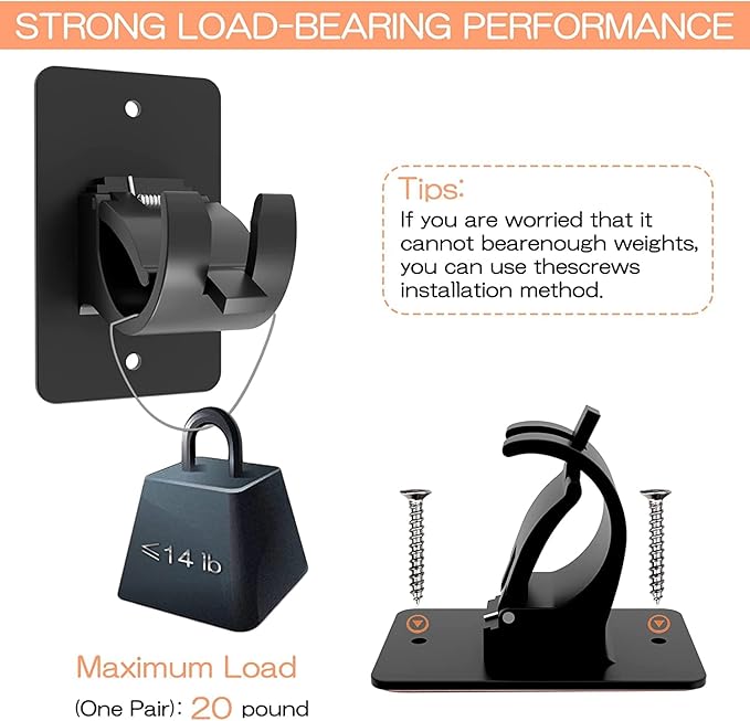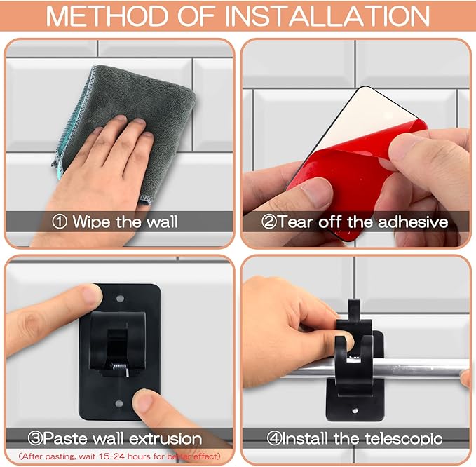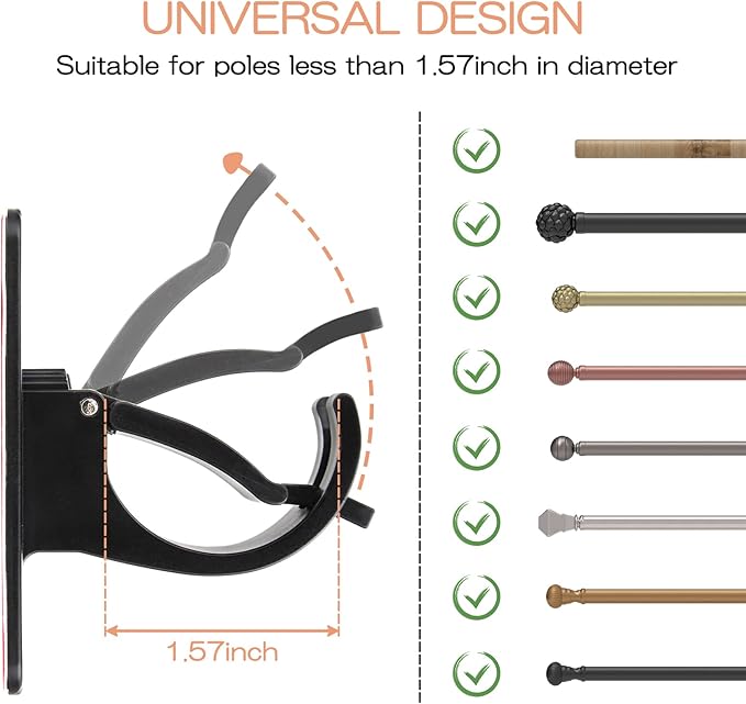 【PRODUCT LIST】You will receive 4 pcs universal plastic self adhesive curtain rod brackets with screw, the curtain pole brackets measure about 3.15 x 1.89 x 2.36 inch. Suitable for all kinds of curtain rod, towel rod or shower curtain poles diameter about 0.6'' to 1.5''. Sufficient quantity to meet your daily use. 【PERFECT DESIGN】2 pcs curtain rod holder use powerful 3M adhesive on the backside can hold up to 14 pounds. If used together with screws, a pair of curtain rod brackets (2 pcs) can hold up to 20 pounds. Adhesive curtain rod holders can ensure the safety of use. 【EASY TO INSTALL】Fits all kinds of walls, wipe the wall and keep it dry. Tear off the protective film and stick it to the desired position (It is better to use 24 hours after pasting). Tips: If your wall is uneven or rough, please install the mount onto the wall with screws. 【QUALITY MATERIALS】Our curtain rod hooks made of quality PC black plastic material and stainless steel, elegant and stylish appearance, suitable for most home styles. Strong and reliable, long service life, light weight, good shape, strong adhesion, good load bearing, waterproof and moisture proof. 【WIDE RANGE OF APPLICATIONS】The practical curtain pole towel rod hooks are applicable for bathroom towel, window curtain, closet shelf, and so on. The curtain rod bracket is suitable for smooth glass, tile, marble, stainless steel and other smooth wall. Beautify your bathroom/bedroom/living room/office.