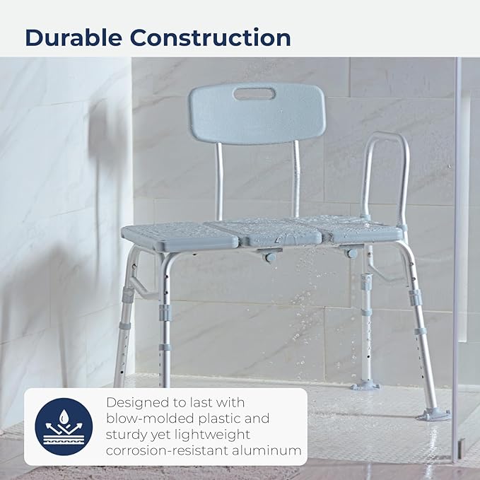 Nullify Enter & Exit the Tub with Confidence: The tub transfer bench makes it easier and safer to get in and out of the tub; simply sit and slide over the bathtub’s side to get in and enjoy the support of the generous seat and backrest while you shower Bathe Independently & Securely: The shower bench seat features stable A-frame construction and its legs include a non-skid, non-slip tip for security on wet surfaces; the bath seat features drainage holes to prevent water pooling, making it a great bath chair or shower chair for elderly users and others requiring support Adjusts to Fit: The bath transfer bench for bathtubs is reversible to fit most bathrooms and its dual-column extending legs can be lifted or lowered in 0.5” increments from 17.5" to 22.5" accommodating most tubs and users Built to Last: Built to last with a lightweight aluminum frame, the shower transfer bench features a limited lifetime warranty Supports Up to 400 Pounds: Seat dimensions: 26" (W) x 18.5" - 19.5" (D); Outside legs: 32" (W) x 23" (D); Weight capacity: 400 pounds