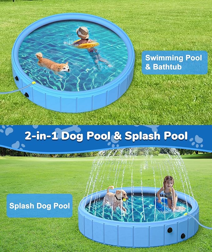 ????[Multifunctional 2-in-1 Design] Our updated pet splash pool is a versatile blend of a common pet splash mat and a dog pool. It serves as a refreshing swimming pool for your pets and creates a playful splash area through small holes on the top, ensuring a joyful water experience during the summer. ????[Enduring and Safe Materials] Crafted from high-quality PVC and sturdy PP hard plastic, this dog pool ensures both safety and durability. The non-slip design on the pool's bottom enhances safety during water play, providing a secure and comfortable environment for your pets to enjoy. ????[Convenient Foldable Design] Featuring a quick and user-friendly foldable design, the pool easily folds to dimensions of 12''*7.5*13. Composed of multiple panels, its intuitive folding design simplifies setup. The compact, portable size after folding makes storage and transportation hassle-free. ????[Large Size and Versatile Use] With an diameter of 79'' and a height of 12'', this pet splash pool accommodates multiple pets and people for shared play. Its versatility allows it to function as a dog toy pool, baby/dog bathtub, kiddie pool, outdoor pool, ocean ball pool, sandbox, and more, suitable for various settings. ????[Smart Water Management] Equipped with an inlet and two outlets, our dog pool ensures efficient water management. The yellow inlet serves as the water source, creating a fountain. Opening the upper outlet helps maintain the water level, while the lower outlet facilitates efficient drainage. Connecting a drainage pipe ensures a cleaner and eco-friendly drainage process.
