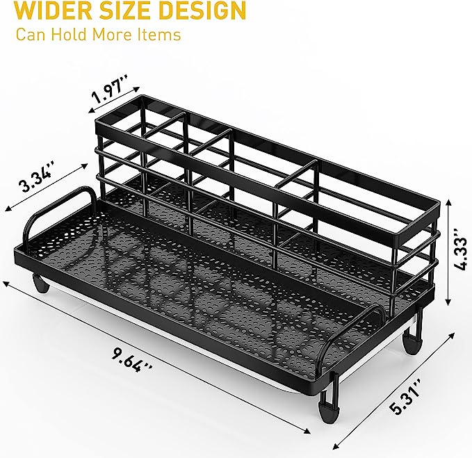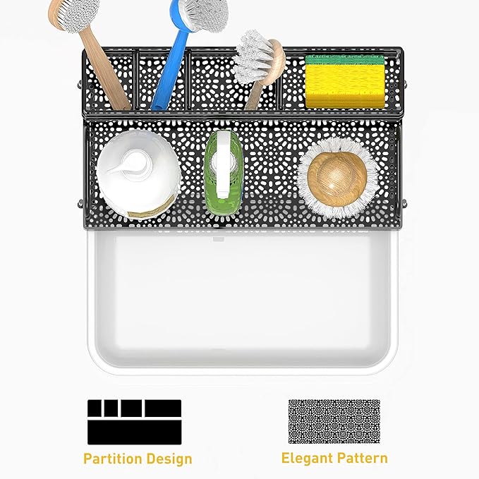 【MORE STORAGE CAPACITY】Compared to other kitchen sink caddy CISILY sponge holder expands to 5.31 inches wide and 9.64 inches long, enhancing its kitchen organization function, and allowing flexible placement of sponges, dish soap, soap dispensers, brushes, sink plugs and more. Make the most of every inch of space and make your kitchen look cleaner. 【REASONABLE DIVIDER DESIGN】 The ergonomic divider design allows it to have 4 separate storage spaces and a storage tray, which can store longer brushes of different sizes without worrying about falling. The front and rear layered design allow you to achieve a visual aesthetic effect. 【KEEP DRY】The sponge holder features an elegant petal pattern cutout design and sturdy stain-resistant tray to keep it looking good. The hollow bottom design increases drainage speed, the drip tray collects excess water, keeps the sink rack and countertop dry. 【REASONABLE DIVIDER DESIGN】 The ergonomic divider design allows it to have 4 separate storage spaces and a storage tray, which can store longer brushes of different sizes without worrying about falling. The front and rear layered design allow you to achieve a visual aesthetic effect. 【SATISFACTION GUARANTEE】 The kitchen sink sponge holder is ready to use upon receipt, no installation required and is widely used on counters or bathrooms, making it a satisfying gift. If you have any questions during use, please consult our customer service staff. We want to provide you with a pleasant shopping experience.This is a recommended kitchen accessories.
