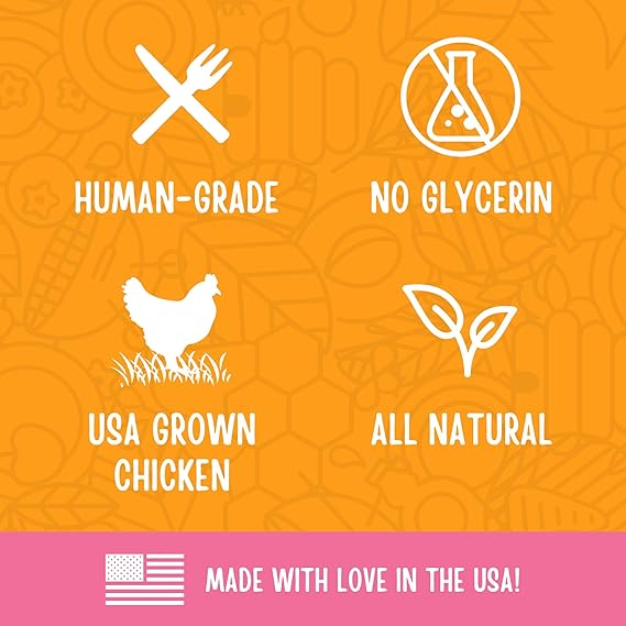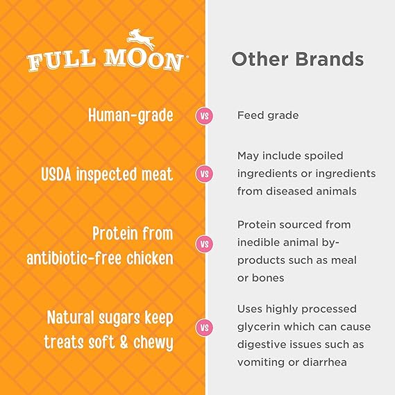 HUMAN-GRADE: If you wouldn’t eat it, why would you feed it? From the ingredients they’re made with to the kitchens they’re made in, our treats meet strict USDA standards fit for human consumption. ALL NATURAL: Our kitchen-crafted Chicken Jerky Hip and Joint contains all natural whole muscle chicken breast, U.S. sourced chondroitin and glucosamine to help maintain healthy hips and joints as well as turmeric, which can reduce inflammation. HIGH QUALITY INGREDIENTS: Truth is our first ingredient. We carefully cook our natural Chicken Jerky Hip and Joint in small batches using honest ingredients like all natural chicken, organic cane sugar, and turmeric—never any by-products or waste. NO GLYCERIN, GRAINS, CORN, WHEAT OR SOY: Our all natural treats are made from wholesome, healthy recipes. Every bite is free from fillers, artificial flavors, preservatives, and colors and chock full of real meat flavor. U.S.-GROWN CHICKEN: Full Moon treats are proudly made in the United States using regionally sourced ingredients, including USDA approved, antibiotic-free chicken.