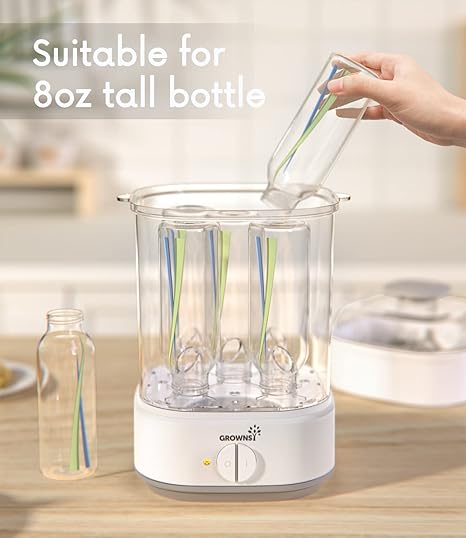 【Lighten up】Grownsy’s bottle sterilizer is smaller than the rest but holds enough daily feeding supplies and get the job done much quicker. Don’t let a slow bulky sanitizer add extra anxiety to your parenting journey. 【Time Saving】- Quickly and effectively sterilize baby bottles and other accessories within 8 minutes, the air column provide 360° all-round disinfection, no more boiling the bottles on the stove and no need to wait for the long dishwasher cycles! This is a must have for working or busy moms. (make sure wash your bottles before sterilizing) 【Peace of Mind】99.99% steam sterilization, automatic shut-off when sterilizing completes, Build-in filter prevent secondary pollution by exposure to new contamination in the air. Easily operation even when holding the baby in one hand. Double protection, Twice as much love. 【Universal Fit】 All brands/sizes baby bottles, pacifiers, pump parts, tiny spoons, teethers and even the occasional wine glass may all find a room in your bottle sterilizer. It’s a nice baby shower gift for modern new parents 【Use 3 Ways and Easy operation】Features only large lower bin, only smaller upper bin and both bin together for different occasions; Use sterilization function with just one simple touch. It’s truly a good helper in the years of raising babies.