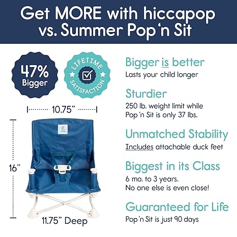 PORTABLE/TRAVEL-FRIENDLY | Planning a day at the beach, a weekend camping, a visit to Grandma’s house, going out to dinner or spending a quiet evening at home? OmniBoost will conveniently, comfortably and safely provide the perfect space for baby to sit, eat, and play. Lightweight FRUSTRATION-FREE folding frame expands and compactly folds down for travel. The rear pocket for bibs & spoons, plus a shoulder carry bag for sanitary storage make the OmniBoost the ideal travel booster chair. COMFORT FIT SAFETY HARNESS | Keep your child fully secured with hiccapop’s gentle restraint system, ergonomically designed to keep even the most wiggly toddler in place and cozy. Plus, the buckles are easily released using only one hand! MACHINE WASHABLE COVER | We all know that babies are messy eaters! Our portable booster seat is designed to effortlessly wipe clean, allowing more quality time with your precious tot. To assist with the inevitable mess, the fabric cover slides off the frame for machine washing - a must have for sanitizing and spaghetti stain removal. DISHWASHER-SAFE REMOVABLE SWIVEL TRAY | Like a personal dining room on the go, this portable baby chair booster seat comes equipped with a convenient attachable/detachable, dishwasher safe and BPA-free tray that swivels for hassle-free in and out. When your little one grows, remove the tray and boost him up to the kitchen table to eat with the grownups! SUPERIOR TIP-FREE STABILITY | We designed the OmniBoost to have a wide, stable base, but we didn’t stop there. We added removable, tip-over prevention “duck feet” to distribute weight evenly and increase stability on soft or uneven surfaces such as sand and grass.