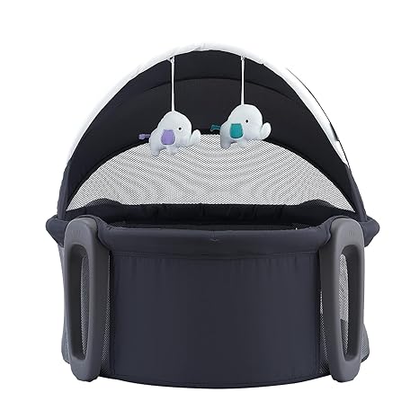2-in-1 portable baby bassinet and play space, perfect for use at home, outside, or while traveling Can be used indoors or out: Adjustable Canopy protects your baby from the sun's rays 2 removable baby toys for engaging play Easy to fold, skin-friendly mattress for baby's comfortable sleeping Convenience & versatility in one--At home, a family trip to the beach, or a quick trip to the office—with the On-the-Go Baby Dome, your baby can stay cozy and entertained no matter where you are!
