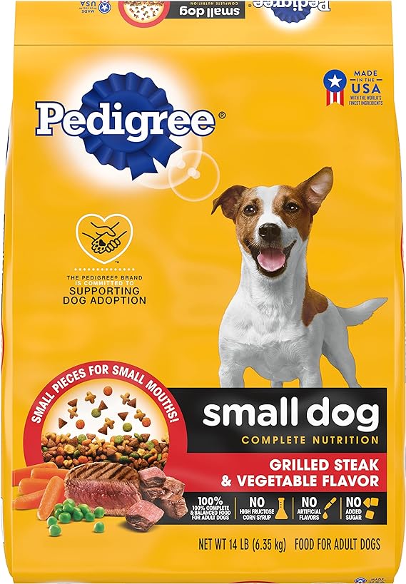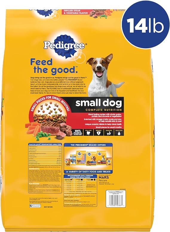 Contains one (1) PEDIGREE Small Dog Complete Nutrition Small Breed Adult Dry Dog Food Grilled Steak and Vegetable Flavor Dog Kibble, 14 lb. Bag PEDIGREE Small Dog Dry Food features a delicious steak and vegetable flavor that provides antioxidants, vitamins, and minerals to help maintain a healthy lifestyle PEDIGREE Food for Dogs features whole grains, protein, and accents of vegetables to help support digestion Complete and balanced nutrition provides optimal levels of omega-6 fatty acid to nourish skin, and help keep your small dogs coat shiny and healthy Proudly made in the USA with the world’s finest ingredients, no high fructose corn syrup, no artificial flavors, and no added sugar Small pieces for small mouths