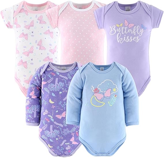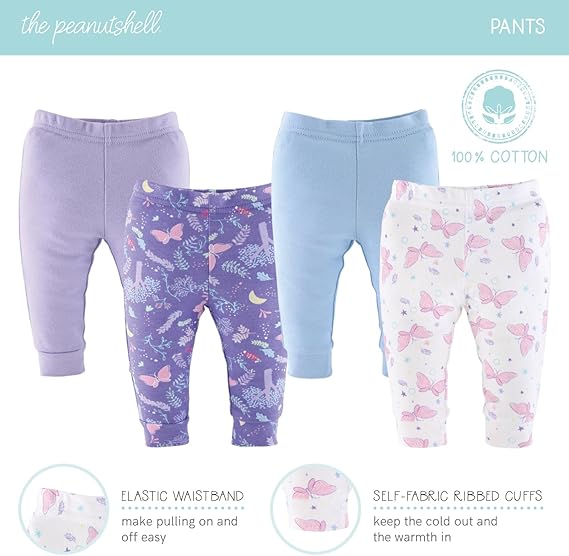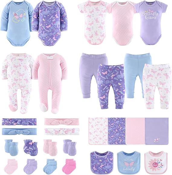 30 MUST HAVE ACCESSORIES: This adorable gift set has all the clothes and linens you need for a baby girl. It includes 3 short sleeved and 2 long sleeve bodysuits, 2 footed sleepers, 4 headbands, 4 pairs of pants, 4 pairs of socks, 4 pairs of scratch prevention mittens, 4 burp cloths, and 3 terry feeding bibs. SOFT 100% COTTON CLOTHING: Knit cotton is the top choice of many parents for its cozy, breathable qualities. You’ll love these soft, 100% cotton baby clothes. You can also use the bodysuits as pajamas or daytime clothes MIX & MATCH OUTFITS: This cute baby gear set is perfect for winter, spring, and summer, and fall. The hats and mittens are a great way to keep your child warm no matter what the temperature is outside. These pieces are also great for layering under coats, winter suits, and blankets. If it’s summertime, the bodysuits work great on their own as an outfit PERFECT BABY SHOWER GIFT: Offer this adorable set as a baby shower gift or to welcome a baby home from the hospital. Containing an assortment of baby clothes and necessities, this set is sure to be appreciated by new parents TOP PARENTING PRODUCTS AWARD WINNER: The Peanutshell Layette is the perfect starter set for new parents. You can even place it in a basket or hamper for a present they’ll never forget. There’s no better way to prepare for a little one’s arrival than stocking up on the basics. Since they’re newborn size, they’re perfect for welcoming home brand new babies