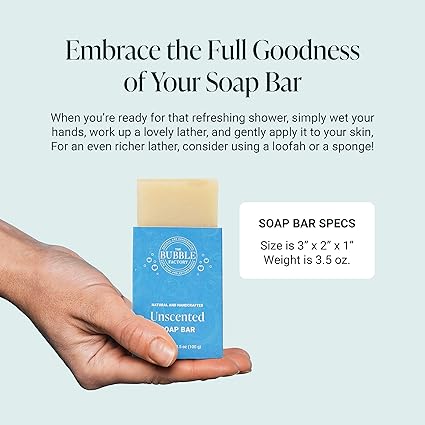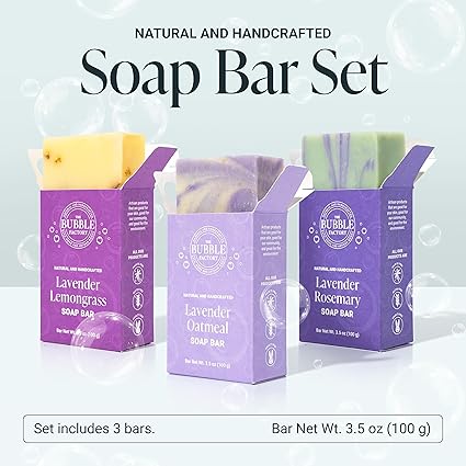 THE BUBBLE FACTORY: From solo soap maker to dedicated team, The Bubble Factory is a Women-Owned and Operated business on a mission to make clean, natural soap a part of everyday life, just as it should be. Each bar is handmade with care in Arizona, USA, ensuring premium quality and supporting local jobs with simple ingredients, while preserving the cold-process method THE COLD PROCESS DIFFERENCE: Traditional soap is made using the cold-process method, where fats and oils are used to create natural glycerin resulting in true soap (most commercial soaps on the shelves use synthetic ingredients that remove glycerin). The cold process allows all the natural goodness to stay intact and enhance our bars with their skin nourishing ingredients (Natural Glycerin, Raw Shea Butter, Natural Oils, Kaolin Clay) LAVENDER COLLECTION SCENTED SOAP BAR: Features all 3 of our lavender scented soap bars - lavender with invigorating lemongrass, exfoliating oatmeal, and earthy rosemary essential oil. A cleansing experience that refreshes both body and soul. Crafted with raw shea butter, they creates a rich, frothy lather, leaving your skin feeling pampered and soft PALM OIL FREE: The Bubble Factory bar soap is crafted in a Cosmetic GMP Certified facility with natural ingredients. Free from harsh chemicals like SLS, phthalates, and parabens. Palm oil free, vegan, cruelty-free, detergent free, non-toxic, and gluten-free soap that is 97% naturally derived (even for the most sensitive of skin). Each bar can last up to 4 weeks with proper drying care and moderate consistent daily use PERFECT GIFT: Available in a variety of scents for women, men, teens and kids (Lavender, Eucalyptus, Patchouli, Mint, Tea Tree, Pine or Unscented) so you are sure to find your favorite. These bar soaps make a great stocking stuffer or add on gift for Christmas, Easter, Birthday, New Mom or Baby Registry, Bachelorette, or even housewarming, get yours today