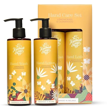 HAND CARE GIFT SET featuring our top hand care products. Includes one Hand Wash and one Hand Lotion in the scent Lemongrass & Cedarwood. Paraben free, synthetic free, suitable for all skin types, and safe for sensitive skin. LEMONGRASS & CEDARWOOD blend for a refreshing, earthy, clean fragrance. Aromatic cedarwood, bright lemongrass, and sweet vanilla and patchouli leave your skin clean, moisturized, and lightly scented. NATURAL HAND SOAP deeply nourishes your skin while gently cleansing and softening your hands. Our foaming hand soap creates a rich lather that leaves skin moisturized and nourished all day. NATURAL HAND CREAM softens dry skin and hardworking hands. Rich, natural lotion helps hydrate, revitalize and condition dry skin all day. The pump bottles are recyclable and made of ocean reclaimed plastics. A coveted gift set perfect for birthday gifts, gifts for her, or new home gifts. VEGAN FRIENDLY & CRUELTY FREE hand made soaps and lotions with natural ingredients and essential oils. Good for your skin and the planet. Use all around your home or gift sets for birthdays, anniversaries, or housewarming gifts.